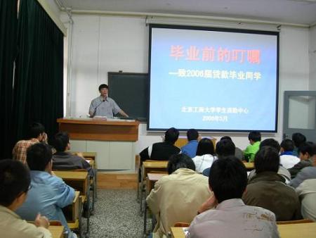 针对国家助学贷款的性质和特点,我们特别注重贷前审核和贷后管理,重点加强对贷款毕业生还款手续的业务指导和季度付息前的信息提示,从2004年起,我们以院系为单位,为贷款毕业生开办《毕业前的叮嘱》讲座共35场,就现代社会个人信誉的重要意义、国家个人征信系统建设状况、可能造成违约的八种情况以及解决办法向学生进行详细的介绍。为方便学生进行贷款业务咨询和偿还贷款本金的学生联系办理《毕业证书》更换手续,我们公布了个人手机电话,几乎每晚6点从良乡回到阜成路校区以后我们都要先回到办公室,为学生办理取证手续。有的学生平时不能请假、有的学生受同学委托、有的学生从外地赶来又要马上返回……只要是学生需求,不管是周末还是节假日,“绿色通道”总会在这里延续。