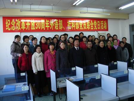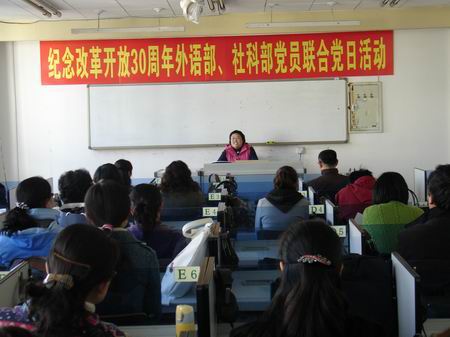 1978年12月,党的十一届三中全会胜利召开,开启了改革开放历史新时期,时间飞逝,转眼改革开放已迎来30周年。 11月18日下午,外语系党支部与社科部直属党支部联合召开主题为“纪念改革开放30年”的联合党日活动。活动由外语系党支部书记张政同志主持,两个支部的党员代表分别做了精彩发言。有的党员同志以其自身的经历和感受,真实地再现了改革开放的历程;有的党员同志用数字、用对比向大家展示改革开放30年前后的变化;有的党员同志从三十年改革开放、三十年伟大复兴来证明改革开放的路是正确的;有的党员从我们所处的复杂的世界形势来说明我们必须坚持走中国特色社会主义道路和改革开放。有的党员从历史发展的进程和背景阐述了改革开放的必然性。党员们或从现象到本质,或从事实到理论,或从叙述到抒情,畅所欲言,博得了在场老师的阵阵掌声。活动在非常愉快和谐的气氛中进行。活动由社科部直属党支部书记刘东超同志做总结发言,刘书记认为中国特色社会主义是人类的文明成果,对中国来说,“中国特色”让社会主义在中国更务实,社会主义让“中国特色”更长远。刘书记还肯定通过这样的活动促进两部门间的交流和对话。