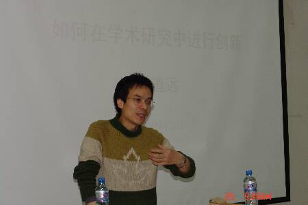 法学院刘道远博士主讲的“如何在学术研究中进行创新”连讲两场。刘博士从自由对学术研究的重要性开始,提出了学术创新需要身体和精神上的自由以及创新是历久弥新和永恒的等观点;接着阐述了创新的两个特征,即借鉴的绝对性与创新的相对性的统一、破与立的统一;进一步讲到了创新的原则,即创新是与人的理性,人文思想分不开的;最后刘博士以“一个笑话,两个误区,五点意见”生动地向同学们讲述了如何创新。