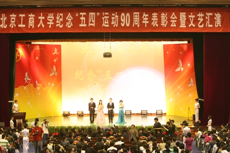 党委副书记卢思锋致辞,他代表学校党委和行政向大家致以节日的问候和良好的祝愿。他指出,五四运动既是提倡民主与科学,解放思想的伟大文化运动,又是反帝反封建的伟大政治运动,在中国历史上具有极为重要的意义。五四运动虽然已经过去90年了,但五四运动所体现的精神、所开创的传统意义仍然重大,影响仍然深远。他强调,纪念五四运动并不仅仅是文艺演出,更应该继承并发扬五四运动的光荣传统。他对学生的成长提出了五点要求:第一,要高扬爱国主义旗帜。第二,要积极投身于建设中国特色社会主义伟大事业。第三,要坚定对马克思主义指导、共产党领导和科学社会主义道路的信念。第四,要遵循深入实际、联系群众的方向,在实践中锻炼成长。第五,要持续培养优良的学风、校风,努力学习,健康成长,发奋成才,报效祖国;大力弘扬奥运精神,大力开展志愿活动,勇于奉献,服务人民;努力加强道德修养,提高文明素养,做到“和谐校园,人人有责”、“校园和谐,人人共享”;全面提升自身的综合素质,承担时代赋予的历史使命,努力为推进中国特色社会主义贡献智慧与力量。
