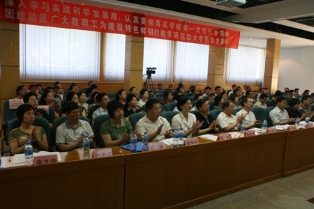 校长谭向勇代表学校向大会做了题为《更新观念 规范管理 加速转型为建设特色鲜明的教学研究型大学而努力奋斗》的工作报告。校长回顾了学校一年来的工作:一是学科及院系布局平稳调整;二是科研工作有力推进;三是教育教学工作日趋规范;四是人才队伍建设不断加强;五是学校党建工作取得新成果。校长提出了今后一段时期学校改革和发展的新思路:一是明确学校定位是学校发展的前提;二是坚持学科建设是学校发展的核心;三是坚持人才培养是学校的根本任务;四是坚持人才队伍建设是学校发展的关键;五是坚持硬件条件的不断改善是学校发展的基础;六是坚持完善运行机制和规范管理是学校发展的保证;七是坚持培育核心价值观是营造良好校园文化氛围的重点;八是坚持以改革创新精神加强党的建设是学校发展的政治保障。校长强调指出,学校第一次党代会的胜利召开,确定了学校今后一段时间发展的战略方向,我们要认真贯彻落实党代会精神,以深入学习实践科学发展观活动为契机,大力更新观念,强化规范管理,加速学校转型,为建设特色鲜明的教学研究型大学而努力奋斗!