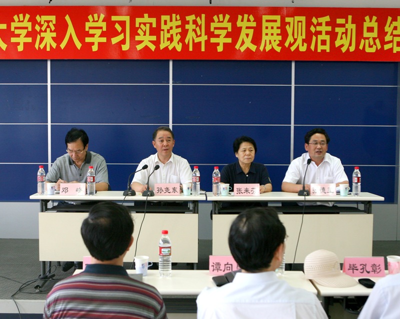 按照学校学习实践活动的总体安排,7月10号,我校在阜成路校区教三楼351隆重举行深入学习实践科学发展观活动总结大会。市委第20指导检查组组长张来芬、副组长邓峰,成员马景娜、王朋信、魏凯,市委教育工委联络员毕孔彰,校领导孙尧东、谭向勇、卢思锋、张德玉、孙宝国、谢志华、李朝鲜、王尚忠、张耘出席大会。全体中层干部、教授、党政秘书、党代表、教代会代表、民主党派基层组织负责人、离退休同志代表、学生代表等参加会议。大会由党委副书记兼纪委书记张德玉主持。