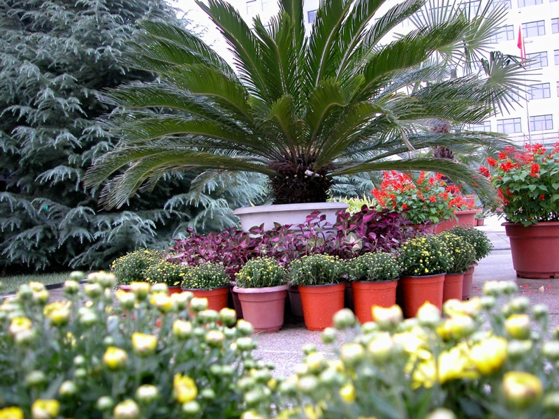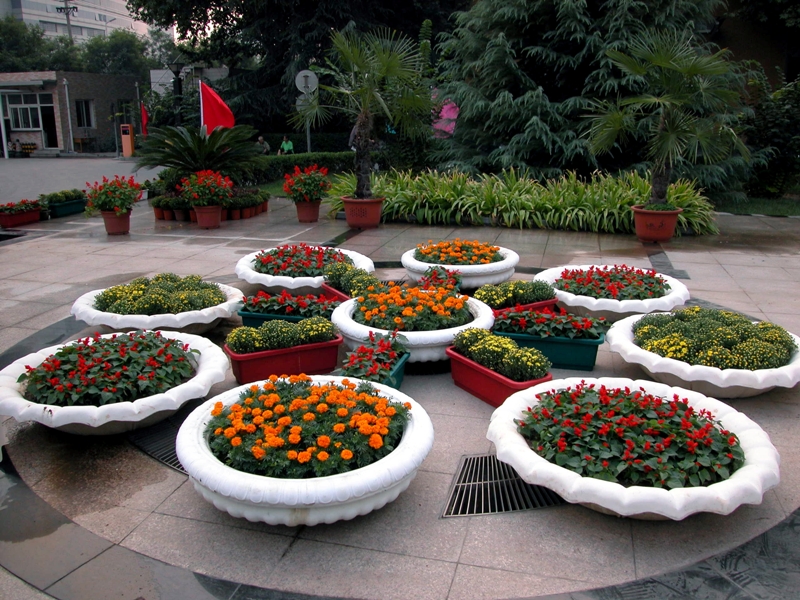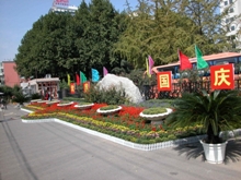 物业中心的绿化师傅们精心培育国庆用鲜花22000盆,阜成路校区布摆大小花坛42个,其中重要地点主花坛9个。良乡校区准备各种国庆用的盆花11000盆,布置花坛5个。绿化师傅发挥聪明才智,用心设计花坛造型:阜成路西区门前的花坛整体造型呈牛头状,象征着拼搏、奋进。整个花坛用红色的一串红、黄色和紫色的小早菊分层拼图而成,在“欢度国庆”和迎风飘扬的彩旗映衬下,色彩绚丽夺目,吸引了过往行人驻足观赏;图书馆门前的花坛是盾牌造型,用紫红色的彩叶草、黄色和粉色的早菊组成,象征着平安、和谐;西区门前广场的花坛是风车造型,在9个花钵里盛满了红色的一串红、黄色的小早菊、橘黄色的孔雀草,象征着一帆风顺;良乡校区行政楼门前的扇面造型成放射状,象征着开放和活力,由红色的火炬鸡冠花、黄色的万寿菊、蓝色的豌豆花、粉色的矮牵牛、橘黄色的孔雀草组成。