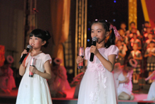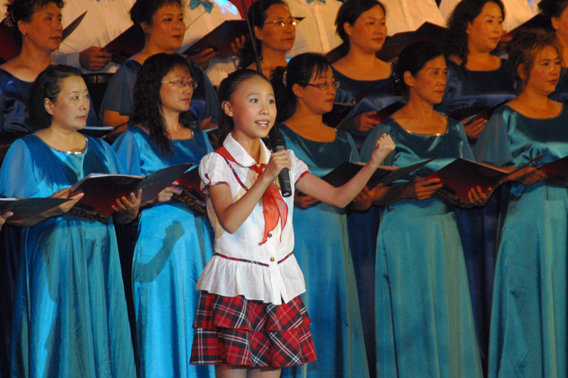 此次演出在我校学生合唱团的一曲《红旗颂》中拉开了帷幕。同学们身着华丽的红色晚礼服,个个神采奕奕,伴随着激昂的歌声,一张张笑脸绽放在绚丽的灯光下,同学饱含深情地诵出了对祖国母亲的一片赤子之心,感人至深。作为领唱的韩添和张一帆同学则带领大家用美妙的歌喉表达对祖国的祝福。场下观众跟随乐曲一齐挥动着手中的国旗,气氛热烈。张一帆在演出结束后告诉记者“正值祖国60年华诞之际,大家欢聚一堂,机会难得,我们与祖国共奋进,我们为祖国献歌喉!” 。