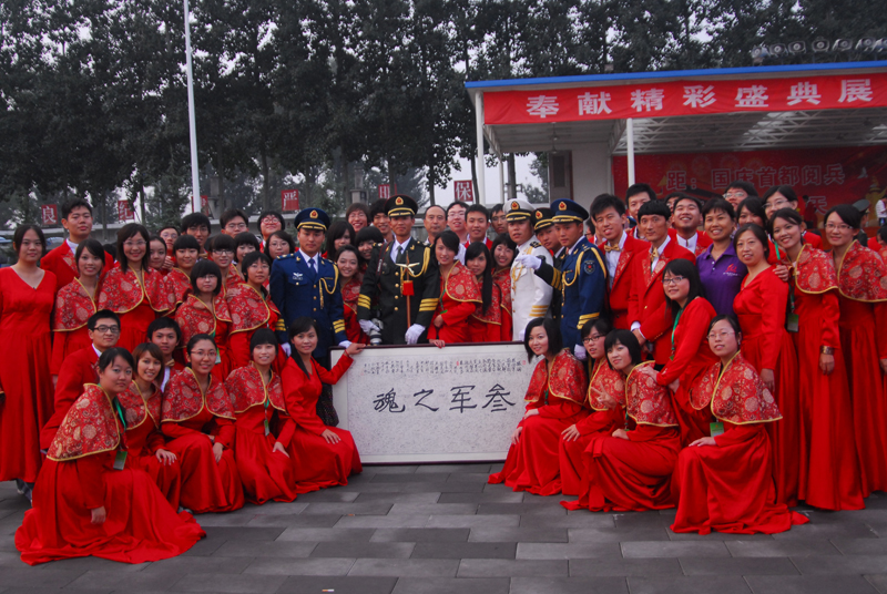 9月27日下午,距国庆阅兵、群众游行还有三天之际,校党委副书记卢思锋同志率我校广场合唱团80名师生再次来到阅兵村,与首都各高校、中小学合唱团员同并肩奋战三个月、结下深厚友谊的解放军联合乐团官兵们进行国庆60周年大典前的最后一次合练。