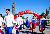 上午11点27分,随着指挥官一声令下,由我校师生为主要成员的“艰苦创业”方阵迈着整齐而坚定的步伐向着天安门走去。随着音乐节奏的变化,方阵成员们做着不同的动作:他们时而徒手握拳作奋斗的手势,时而把花环放在胸前有节奏的摇动,当方阵走到天安门正前方的时候,所有队员一齐把花环高高举过头顶,整个方队瞬间成为一片繁花似锦的海洋。这激动人心的一幕深深感染了在场检阅的国家领导人和参加观礼的各界群众,大家都情不自禁的鼓起掌来。