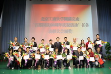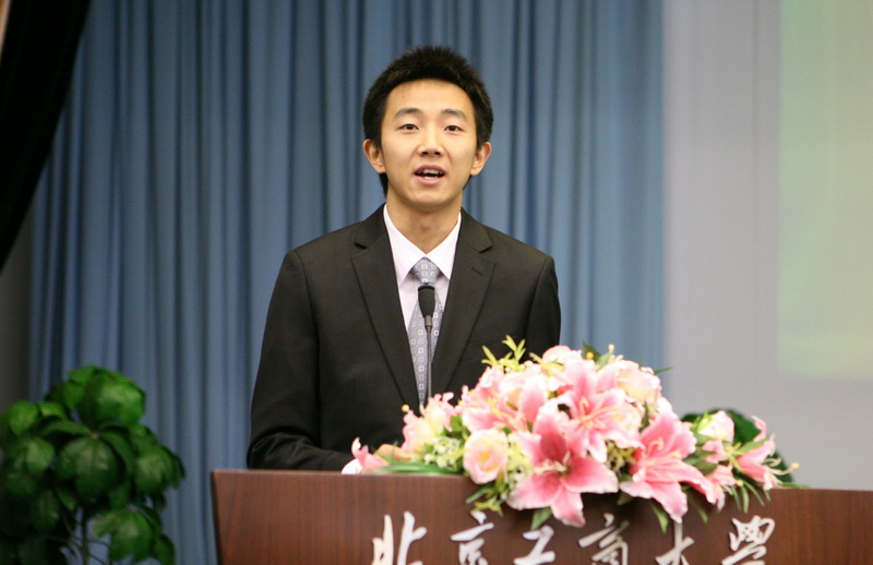 随后,五名在国庆训练期间分别肩负不同任务的老师、同学分别作为参训教师、方阵中的学生、合唱团队、广场联欢团队及后勤保障团队的代表上台做了发言。发言当中,既有教师为同学送鞋赤脚走过长安街的感人瞬间,又有同学们雨中训练、长途跋涉的不畏艰难,还有各部门工作人员为保障国庆任务顺利完成所做出的巨大贡献。代表们真挚的话语感动了在场每一位老师和同学。