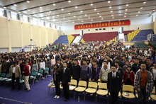 庄严的国歌声,激昂的红旗颂,磅礴的东方红乐曲再一次奏响,现场师生的思绪跟随着乐声被带回到了那一段难忘的时光。十月一日,当由我校两千余名师生组成的“艰苦创业”方阵通过天安门金水桥前的时候,我们听到了来自全世界的掌声。这光荣绽放的一刻,来自于整整三个月的拼搏。“难忘二00九年的夏天,难忘新中国的六十庆典”, 卢思锋副书记的亲笔题词出现在大屏幕上。一段记录了我校方阵成长历程的视频呈现在每一位师生面前。从训练初期的点滴到盛典前的忙碌,短短几分钟的视频却珍藏了全体师生难忘的回忆。视频播放结束以后,会场响起了长时间的掌声。