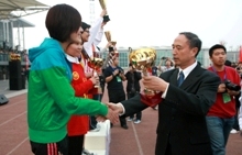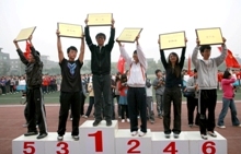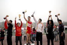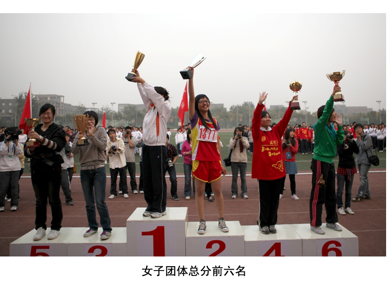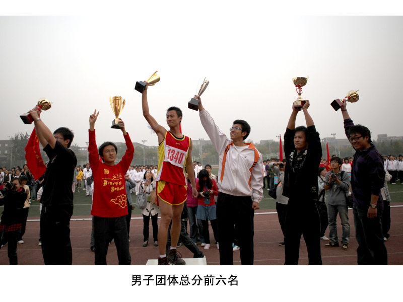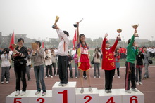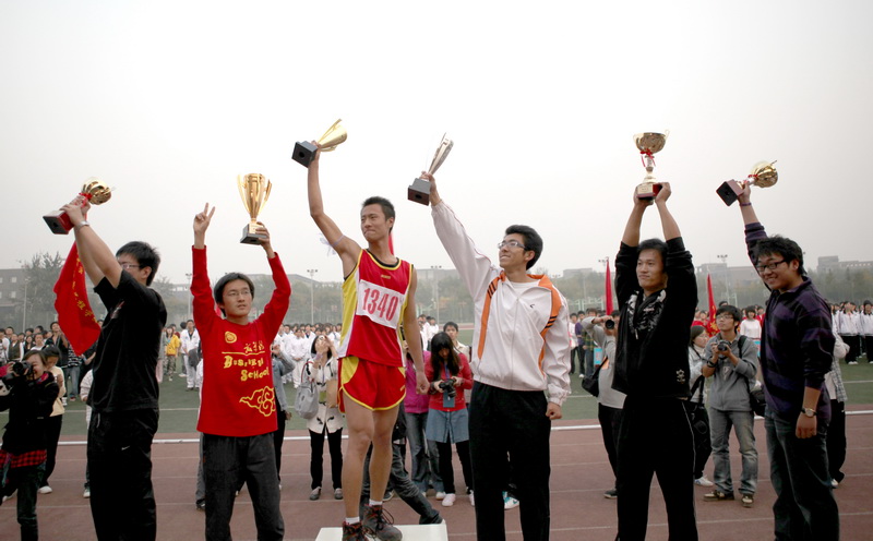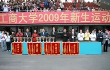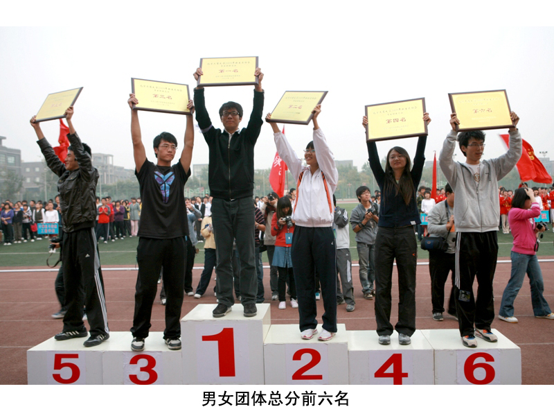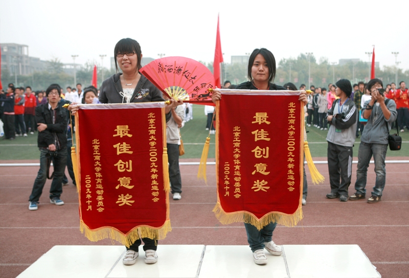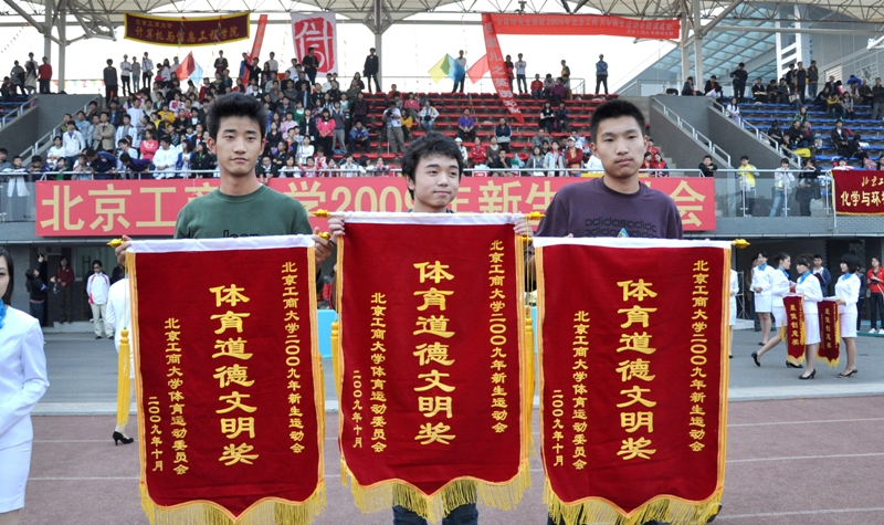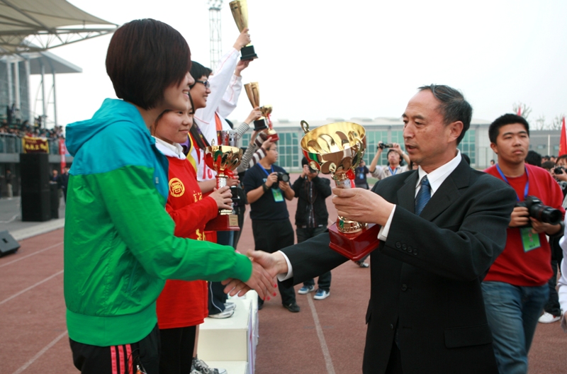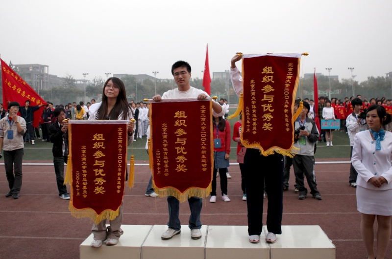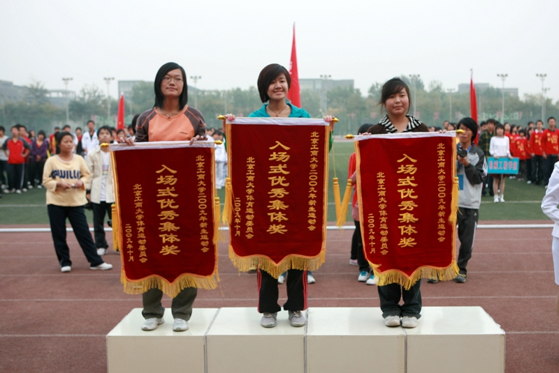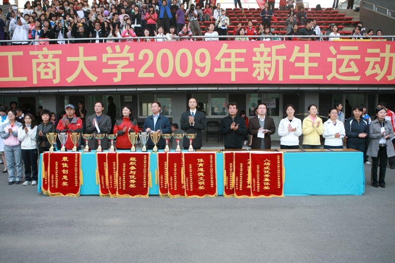 运动员列好了整齐的队伍;奖杯、奖牌、锦旗等待着他们的主人;观众们也热切地期待着比赛结果。下午4:30,我校良乡校区的操场上,新生运动会闭幕式准时举行。党委副书记卢思锋和各职能部门及院系负责人出席闭幕式。校办主任吉涛主持闭幕式。 体育教学部王少华老师宣读了女子团体总分、男子团体总分、男女团体总分前六名的院系。女子团体总分前六名分别是:嘉华学院、计算机与信息工程学院、经济学院、商学院、化学与环境工程学院、艺术与传媒学院。男子团体成绩前六名是:计算机与信息工程学院、嘉华学院、商学院、机械学院、法学院、经济学院。男女团体总分前六名是:计算机与信息工程学院、嘉华学院、商学院、经济学院、机械学院、艺术与传媒学院。 党委宣传部副部长袁小年宣读了本次运动会集体奖获奖名单。经济学院、材料科学与工程系、外语学院获体育道德文明奖;计算机与信息工程学院、商学院获得最佳创意奖;化学与环境工程学院、研究生部、嘉华学院获得组织参与优秀奖;机械工程学院、艺术与传媒学院、法学院获得入场式优秀奖。由经济学院组成的红旗方队也受到了表扬。 随着比赛结果的公布,观众席上的鼓声、锣声、欢呼声此起彼伏,在这片欢呼声中,党委副书记卢思锋为取得女子团体总分前六名、男子团体总分前六名、男女团体前六名的院系颁奖。党委宣传部副部长袁小年为获得体育道德文明奖的院系颁奖。体育与艺术教学部主任顾红为获得最佳创意奖的院系颁奖。保卫处处长顿劲松为获得组织参与优秀奖的院系颁奖。团委书记吕良为获得入场式优秀奖的院系颁奖。 党委副书记卢思锋在讲话中,对本次新生运动会的圆满成功表示祝贺,同时对为运动会的顺利举办付出努力的各部门人员表示感谢。最后,他宣布2009年新生运动会胜利闭幕。