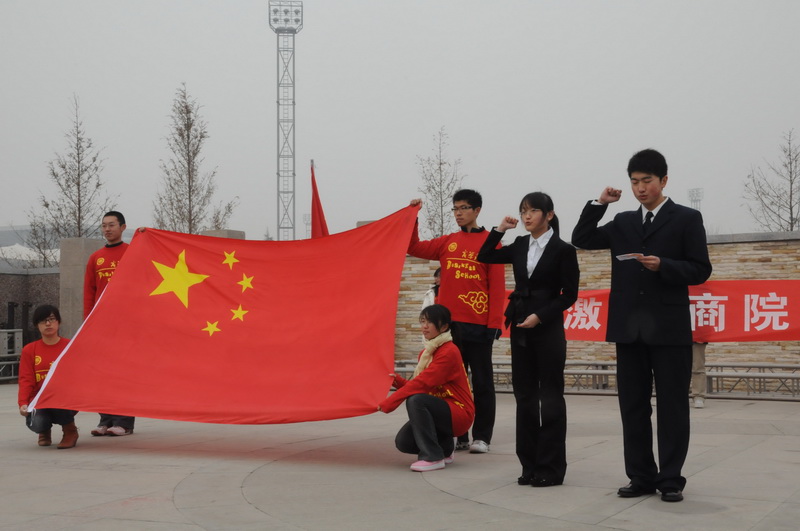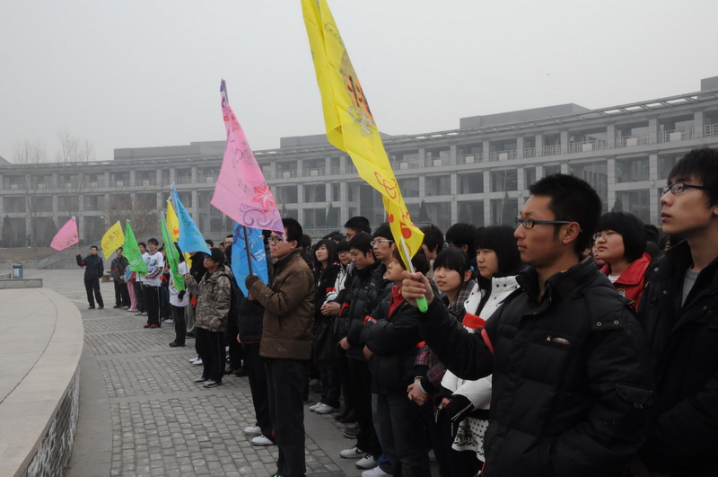 在商院火红旗帜的带领下,大一年级十五个班级的同学从下沉广场出发,沿着学校教学区的主干道慢跑起来。整齐的行进队伍中不时爆发出嘹亮的爱国口号。天气虽然格外寒冷,但同学们的情绪却异常高涨。