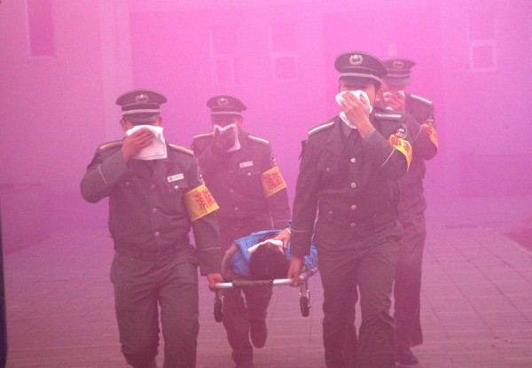 16:30警报长鸣,烟雾滚滚,消防演习正式开始。2000多名新生以毛巾掩面,有秩序地从烟雾中穿过。模拟现场非常逼真,给人以身临其境的感觉。四名保安人员还现场模拟了火场救护。之后,参演学生在生活区前操场集合,徐进团警官现场讲解了灭火器的使用方法后,部分学生和后勤人员饶有兴趣地在四个火堆前亲身体验了灭火器的使用。最后保安人员用消防水带将火堆扑灭。