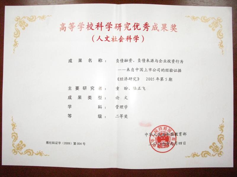 根据《高等学校科学研究优秀成果奖(人文社会科学)奖励办法》规定,高等学校科学研究奖励办公室经组织专家评审、奖励委员会审定通过,共评选产生2009年度拟获奖成果649项,其中一等奖38项,二等奖205项,三等奖393项,成果普及奖13项。我校商学院童盼教授的成果《负债融资、负债来源与企业投资行为》荣获二等奖。