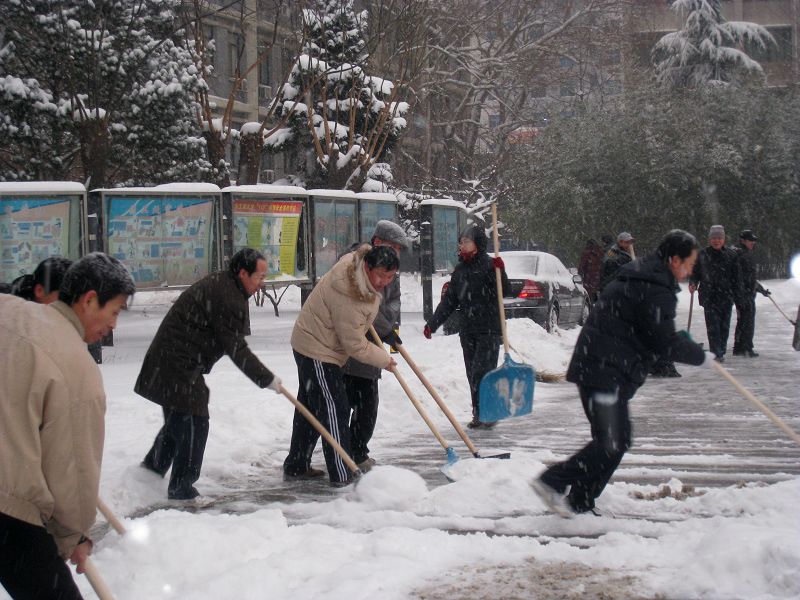 由于降雪没有停,为保证节后师生员工的出行安全,后勤号召大家发扬不怕疲劳、连续作战的精神,要求全体员工4日早7点上班,全部投入到扫雪工作中,全力迎接新年的第一个考验。有的家远同志担心路滑不好坐车,早上六点就出家门,顾不上吃早饭。有的同志前一天扫雪感冒了,还是坚持参加扫雪。校门口值班的保安也一同帮助扫雪。