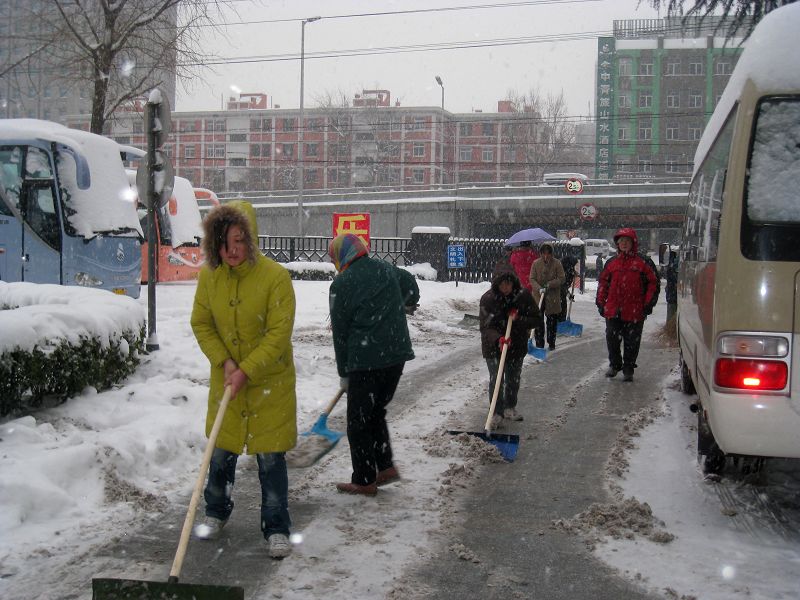 221时左右,后勤处领导及物业中心负责人就开始电话通知:启动学校扫雪铲冰工作预案,按预先划分的责任区、责任人,及时开展阜成路、良乡校区的扫雪铲冰工作。3日早上5点,物业中心的保洁员就开始在阜成路校区、家属区扫雪,6点公寓值班的同志开始打扫学生宿舍门前积雪,7点物业中心的其他员工也加入到扫雪的行列中。下午3点多,在后勤主管校长呼文亮、后勤处处长魏冰、副书记张建平、副处长卢灿宽、尹宝星的带领下,后勤处、综合中心、物业中心、维修中心、公寓中心、饮食中心、运输中心的100多名职工,纷纷赶往学校,陆续投入到扫雪队伍中。尽管天气寒冷,但大家干劲十足,红彤彤的脸上挂满了汗水和雪水,直到天色渐黑,大家才回家吃饭。