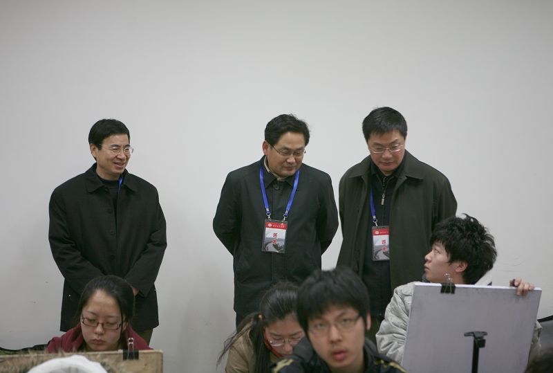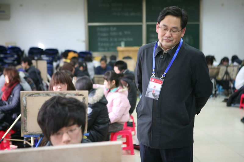 张德玉和李朝鲜询问了报名人数、考试安排,查看了考场并慰问了现场负责考务的老师。招生办老师向到场的学校领导汇报了考生考试情况。教务处处长张晓堂因担心考生挤在一起作画太拘束,建议尽量将考生安排在大教室。