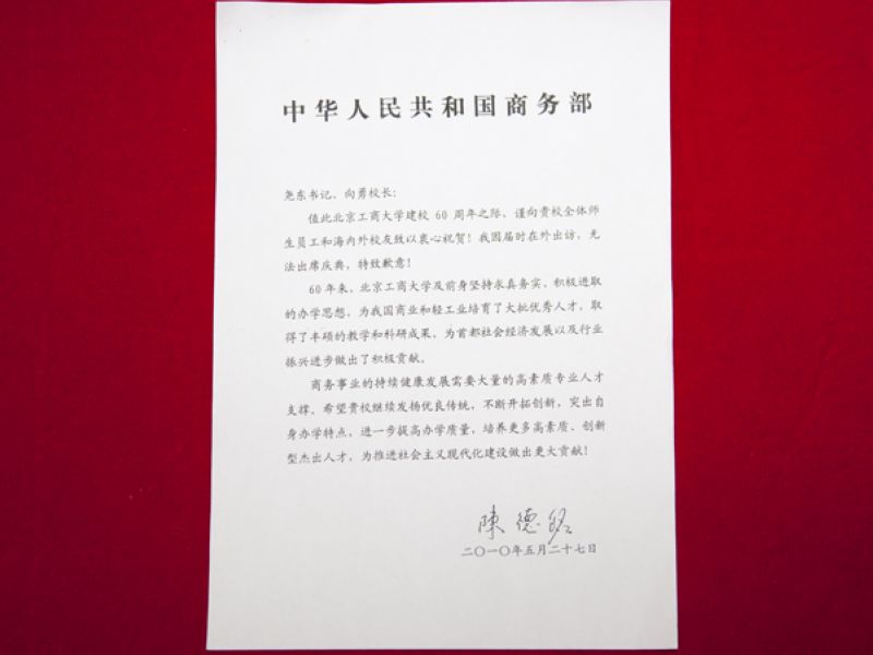 【校庆日】商务部部长陈德铭为我校校庆发来贺信