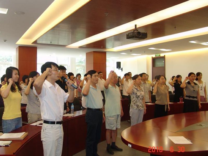 第一项议程是2009-2010学年新发展的党员与老党员共同宣誓。新老党员们全体立正、举起右手,面对党旗庄严宣誓。