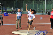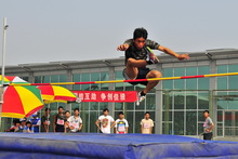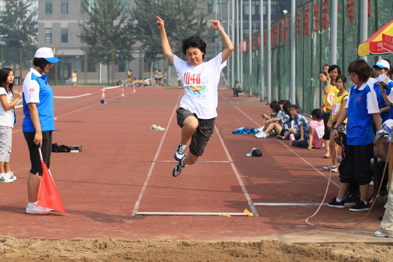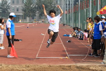 助跑!弯腿!蓄力!起跳!前冲!在男子跳远预决赛现场,参赛队员的激情和活力展示着工商学子积极向上的风采。只见一个身着迷彩短袖的男生以百米冲刺的速度助跑,起跳线前腾空一跃,连胳膊上缠绕着的紫色丝带都跟着跳动起来。腾空的身影,青春的迷彩,紫色的丝带,连脚下金黄的沙坑都跟着跃动起来。