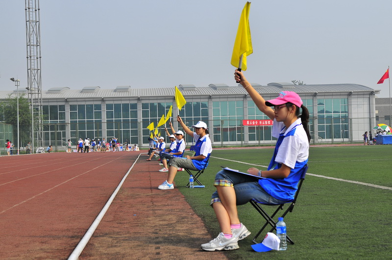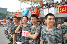 首先进行的是男子100米的预赛。参赛运动员有的身着休闲T恤,有的穿上专业的径赛服装,但是由于这次运动会正值军训期间,赛场上还多出了一抹靓丽的绿——迷彩军装。