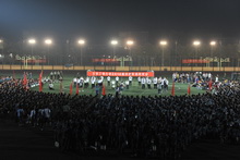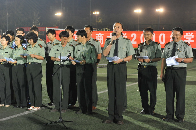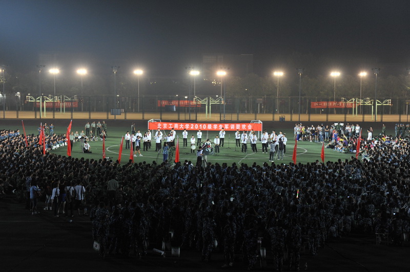 我校2010级军训联欢会于9月9日晚8点半在良乡校区操场举行。校党委副书记、军训总指挥卢思锋,武警部队副政委、军训团团长吕彦华中校,学生处处长、军训团政委吕素香,保卫处处长顿劲松,宣传部副部长袁小年,学生处副处长、军训团副团长徐红京,保卫处副处长、军训团副团长陶伟,校团委书记、军训团副政委吕良等领导出席与学生共度联欢。各营教官及各院系辅导员或参与其中,或到场观看。