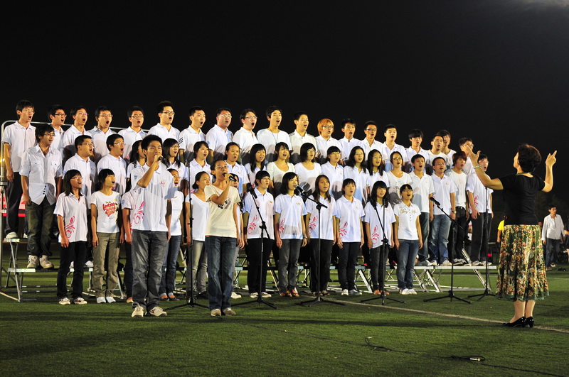 五营学生展示的“口技+现代舞串烧舞”节目开始时有不少同学起立观看,十个人或唱或跳最后还与五营同学一起喊出了他们的口号。其中模仿费玉清《千里之外》的歌声赢得学生掌声不断。校舞蹈团的《校园变奏曲》向同学们展现了学生一天的生活状态。
