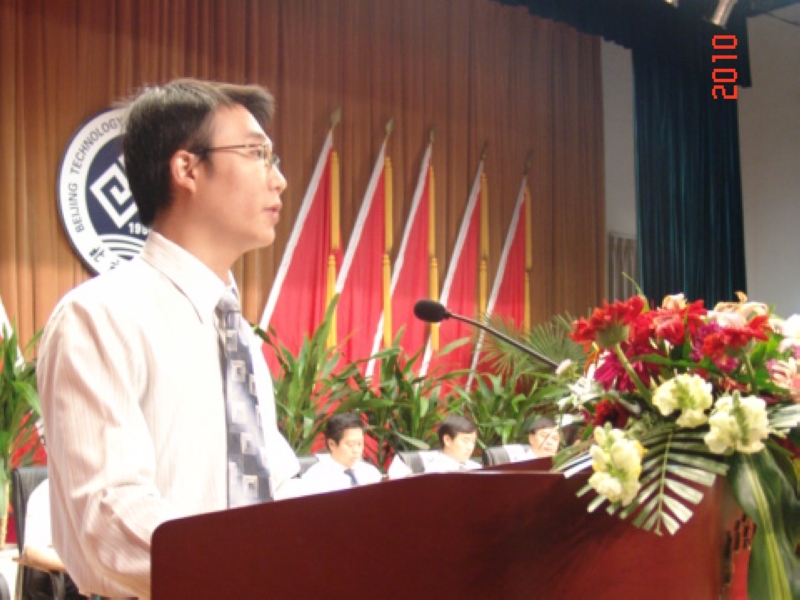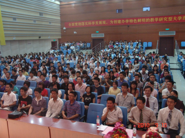 首先,胡俞越教授代表全体研究生导师发言,向新同学的到来表示欢迎。胡俞越教授勉励研究生要把握大好时光,投入到知识的海洋,不断求索,勤奋创新。他意味深长的说:“一日为师,终生为友”,认为没有比学生取得成就更让人欣慰的事,而老师只是学生的观众,时刻准备为学生们的成就而骄傲自豪。随后,在校研究生代表和新生代表分别发言。高年级的杨帅同学在发言中希望新生能够珍惜学习机会,珍惜同学和师生情谊,珍惜宝贵时间,不断努力奋斗。并代表全体研究生祝老师们“教师节快乐”,此时,新生代表们向在场的领导和老师献上了鲜花,表达学生们对师长们的节日问候和祝福之情,掀起开学典礼上的一个高潮。2010级新生韦碧雪代表新入学的研究生表示将会认真学习,努力钻研,在科学探索的道路上不懈追求。