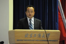 来自友好合作单位的代表房山区教委副主任米忠诚同志讲话。他提出社会实践践行了“我实践,我成长,我奉献,我快乐”的理念,并感谢暑期实践活动的老师及同学为房山区的中学生们带去了丰富多彩的知识,希望我校与房山区巩固成果,扩大影响,继续进行深度合作,在往年暑期社会实践的基础上探索合作化、常态化的工作新方法。