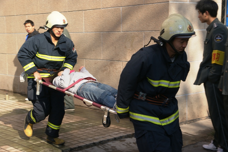 13:00,随着消防演习总指挥呼文亮副校长的一声令下,阜成路校区东区学生公寓3号楼警笛长鸣、烟雾滚滚,参加演习的400多名学生以毛巾掩鼻,有序地从宿舍楼撤出。海淀消防支队的消防员正在用担架紧急抢救“伤员”,整个场面非常逼真。