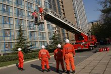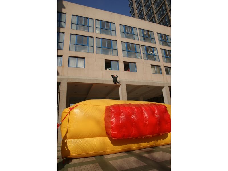 清点人数之后,参演人员观看了海淀消防支队用救生气垫进行的救生模拟表演,一名消防队员以规范的动作从三层楼跳到地上的气垫上,然后以熟练的动作安全地滑落到地面,引起同学们的唏嘘呐喊;之后,参演师生又饶有兴趣地观看了消防队员的高层救生表演,一名消防员乘坐高空救生梯从八层楼的窗户上救下一名参演保安,引起在场师生一片掌声。