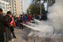 在消防队员的示范指导下,所有参演师生分别在两个火堆前用灭火器进行了灭火演习,之后又观看了消防队员用消防水带进行灭火表演。