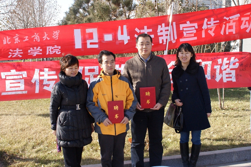 首先,法学院学生制作了图文并茂,细致精美的法律宣传展板供大家阅读,别出心裁地制作了“法律智慧树”以开展法律知识竞赛。这种极具创造力的宣传方式,吸引了来往师生们的眼球,纷纷上前仔细观看,积极参与到活动中。其次,学院邀请了东城区司法局的两位法律专业人士:吴博和晏涛同志特意来到现场,以提问解答的方式提供相关法律法规咨询,促使同学们踊跃提问,实现了交流互动,活动现场气氛热烈。最后,法学院党总支副书记文四英和团总支书记尹航为司法局两位专家颁发聘书,特聘两位专家做为法学院学生的社会实践指导老师,以带动法学学生的社会实践。
