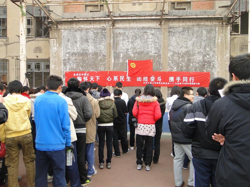 在凛冽的寒风中,在主题横幅“胸怀天下,心系民生,团结奋斗,携手同行”和团旗的映衬下,研究生纪念“一二•九”运动爱国耐力跑活动开始。首先许欣老师讲话肯定了“一二•九精神”的重要性,表达了对同学们的殷切希望,希望大家继承和延续“一二•九精神”,并落实到实际行动中去。随后,赵炜同学声情并茂的历史介绍似乎把大家拉回了75年前,让在场的同学热血沸腾,脑海里回荡起一幅幅画面。一二•九运动作为中国共产党领导的一次大规模学生运动,虽然已经过去了75年,但其精神被不断传承和发扬。对入团誓词的重温和《歌唱祖国》的响起,心头泛起爱国热情的同时也再次激起了我们青春的激情与活力。随后广大同学纷纷上台签名,表达了“承继精神在成长中铭记”的决心。
