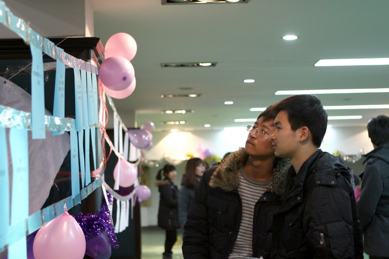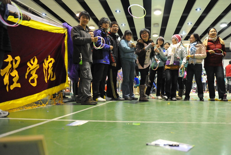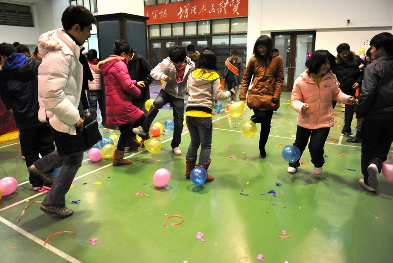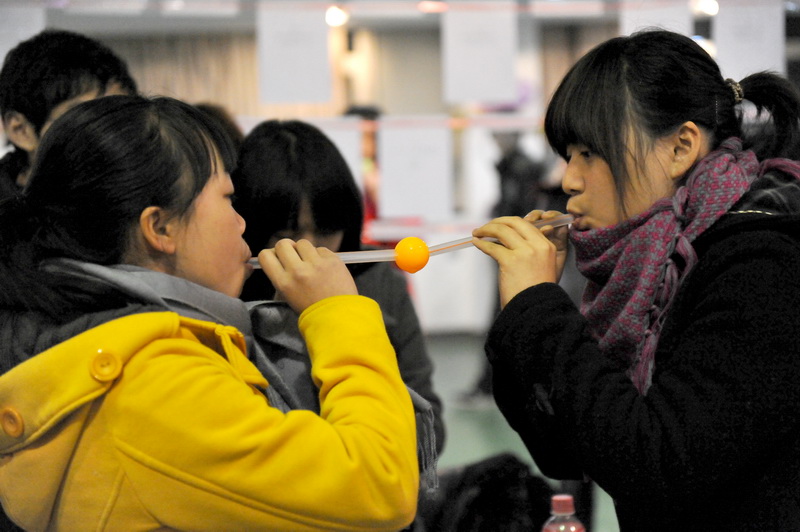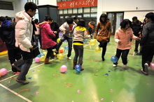 只见三对同学背靠着背夹着一只气球,奋力向终点——椅子,发起冲击,最先到达的人把气球放到椅子上,接着奋力一坐,只听“啪!”一声,比赛的冠军诞生了!这就是机械工程学院在今年游艺会上的重头游戏。据游戏负责人介绍,机械学院这次还准备了“蹲蹲乐”和“五毛和一块”活动。