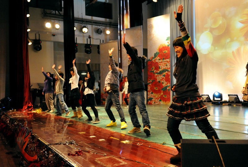 动感的多人现代舞再次激励了同学们,还在座位上的观众按捺不住激情纷纷进入舞池与舞者一同跳舞。新颖的《甩葱舞》,以幽默的形式,让现场同学都挥舞起了手中的荧光棒,欢快地舞动、转圈。最后,现场的所有观众及工作人员伴随着兔子舞的音乐在舞池内围成一个多层的大圈,尽情跳动。