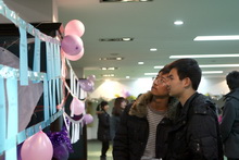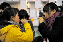 从艺术与传媒学院活动场地走出了几位“亮”女,她们或是腮边、或是眼角、或是眉间、或是手背都有一抹闪亮的色彩。原来那抹色彩是她们游戏获得的奖品——“人体彩绘”。还有一位短发的女生正端坐着面对一位手拿画板的男生。这位女生刚刚将乒乓球掷进了由饮料品摆成的心形的正中心。而她的奖品,正是这位男生现场为她手绘的脸部速写。