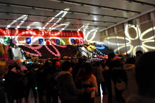 在文体馆外,搭建起了大约10米长的临时小屋。小屋四周流光溢彩,洋溢着节日的喜悦;屋外的蓝布式地毯上密密集集地挤满了学生;食物的香气和热气混合着同学们的笑声充溢着北工商的元旦之夜。
