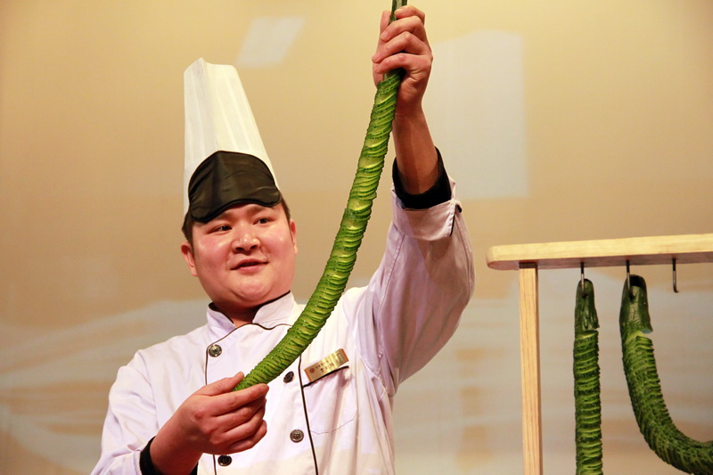 在《劳动者的风采》这个节目中,大厨的刀工给同学们留下了深刻的印象,几个痴迷的观众竟追着大厨到了后台,围着大厨刚切出的“蓑衣黄瓜”不停地拍照,最后“蓑衣黄瓜”难逃被抢吃一空的命运,师傅看着这情景只能哭笑不得。