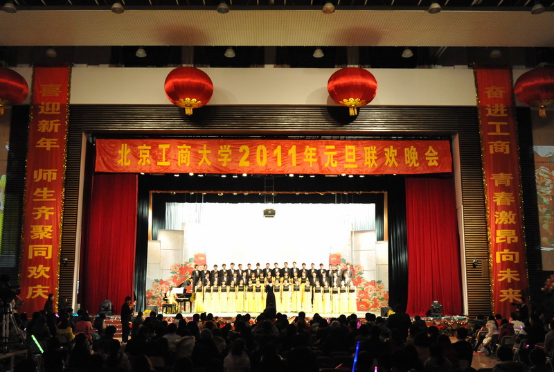 良乡校区文体馆内,装饰一新的舞台上挂着四个大红灯笼,两侧分别悬挂着“喜迎新年,师生齐聚同欢庆”和“奋进工商,青春激昂向未来”的对联。五彩缤纷的气球将会场点缀得绚丽多彩,整个会场洋溢着欢乐的气氛。 12月31日晚,2010年元旦联欢晚会掀开了神秘的面纱,我校师生齐聚一堂,欢庆元旦佳节。