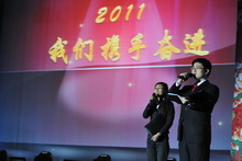 除了有热情洋溢的管乐演奏、异域风情的舞蹈、动听优美的歌曲……此次晚会还将“春晚”提前搬到了舞台上。外请嘉宾贾铃、白凯南将在今年春晚上演《大话捧逗》,而今晚他们特意为我校量身打造了相声《大驾光临》。风趣幽默的台词,夸张搞笑的动作,引来台下的一片笑声。