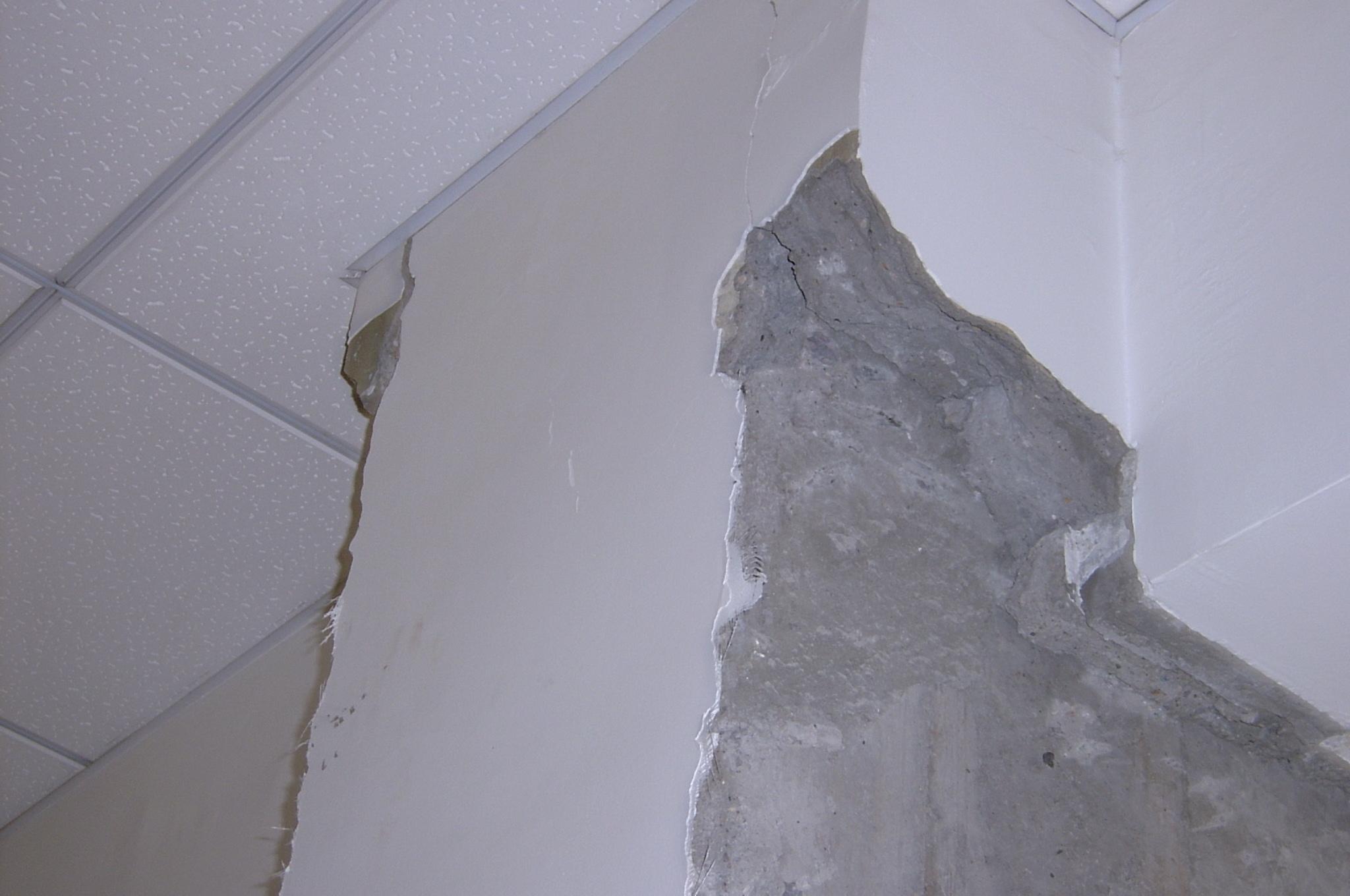 大家重点查看了图书馆建筑表面剔凿后的建筑结构,尤其是梁、柱、墙等关键部位。通过考察发现,图书馆基础建筑结构的部分关键部位存在重大隐患,总体情况比较严重,加固方案还需要进行相应调整。