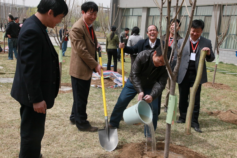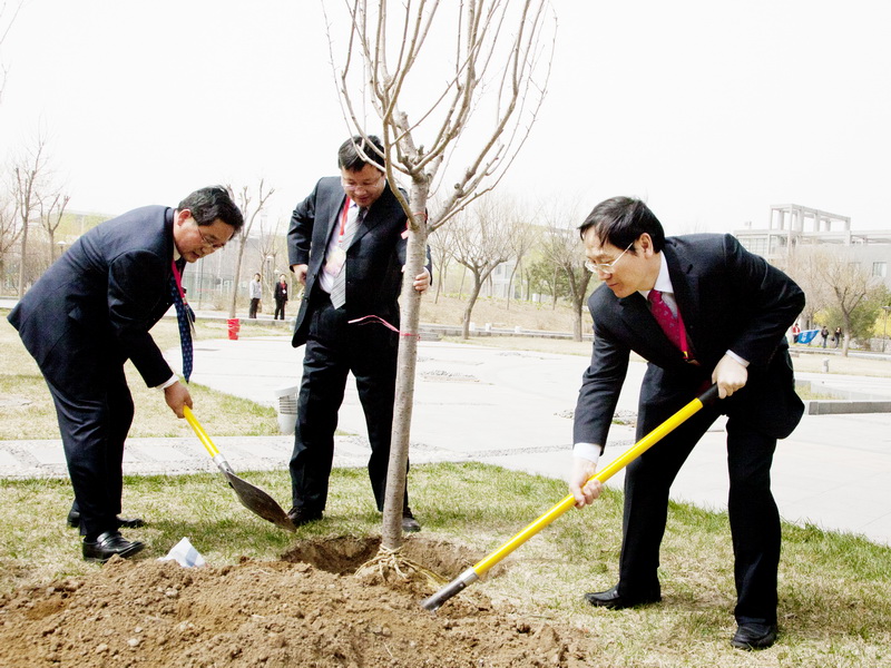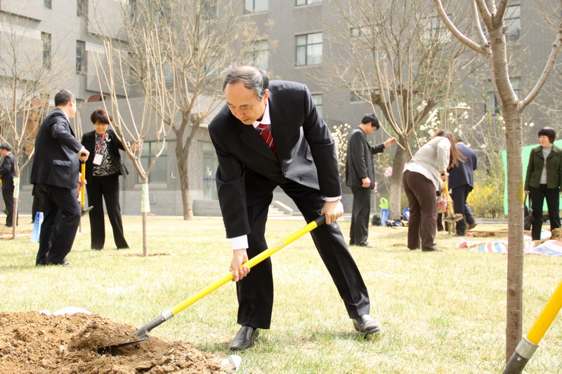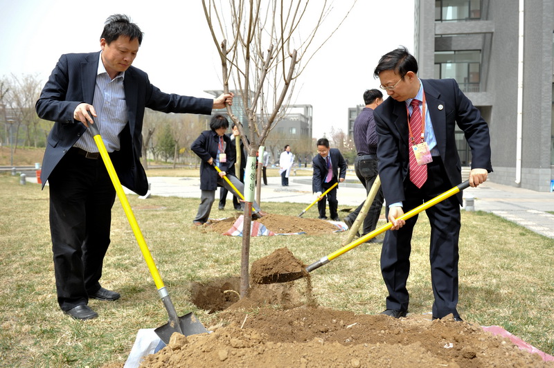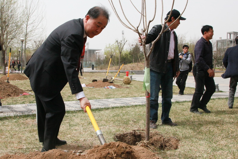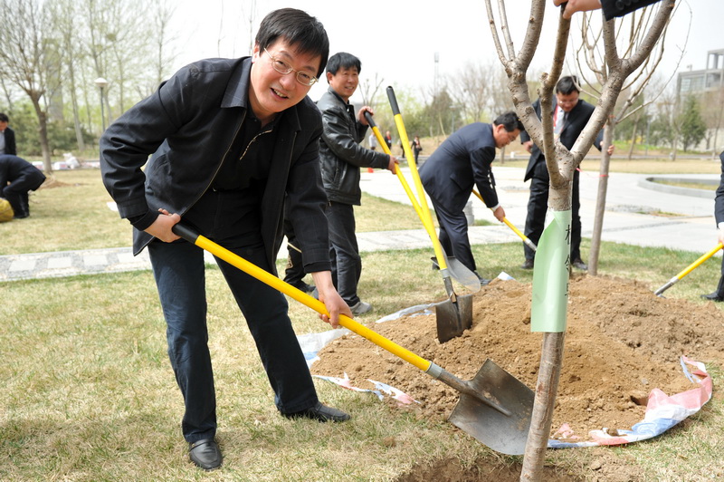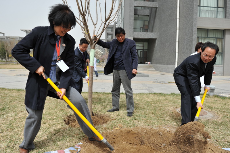 4月9日中午,春光明媚,万物复苏。参加完“双代会”开幕式的代表们来到良乡校区文科二、三号楼西侧的绿地,亲手种下了樱花26棵、移植海棠5棵;为游泳馆、科研楼南侧绿地银杏树培土22棵。