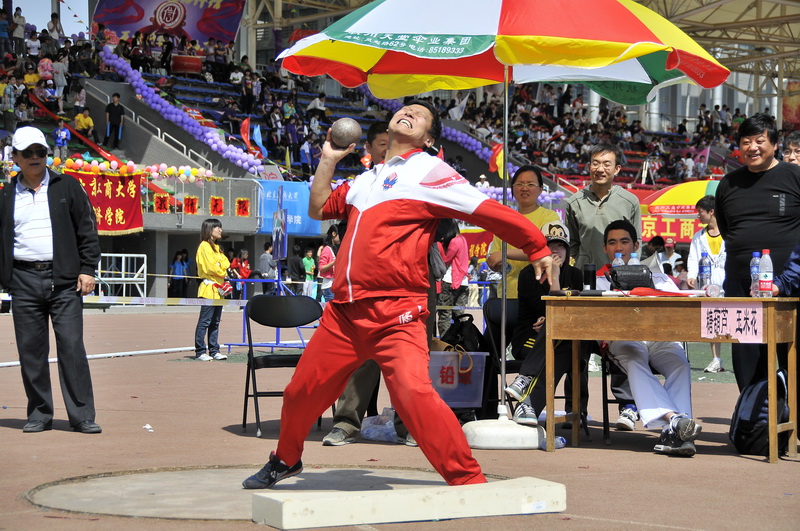 比赛开始了,只见他平稳的托着重达7公斤的铅球,专注地锁定着远方的目标并积着全身的力量。他缓缓地将铅球夹在头与肩之间,深呼吸。接着一个漂亮的转身,迅速有力地将铅球推送出去,铅球划过一道完美的弧线,动作毫无拖沓。很难想象,一位50多岁的老人仍有如此的力量与活力。