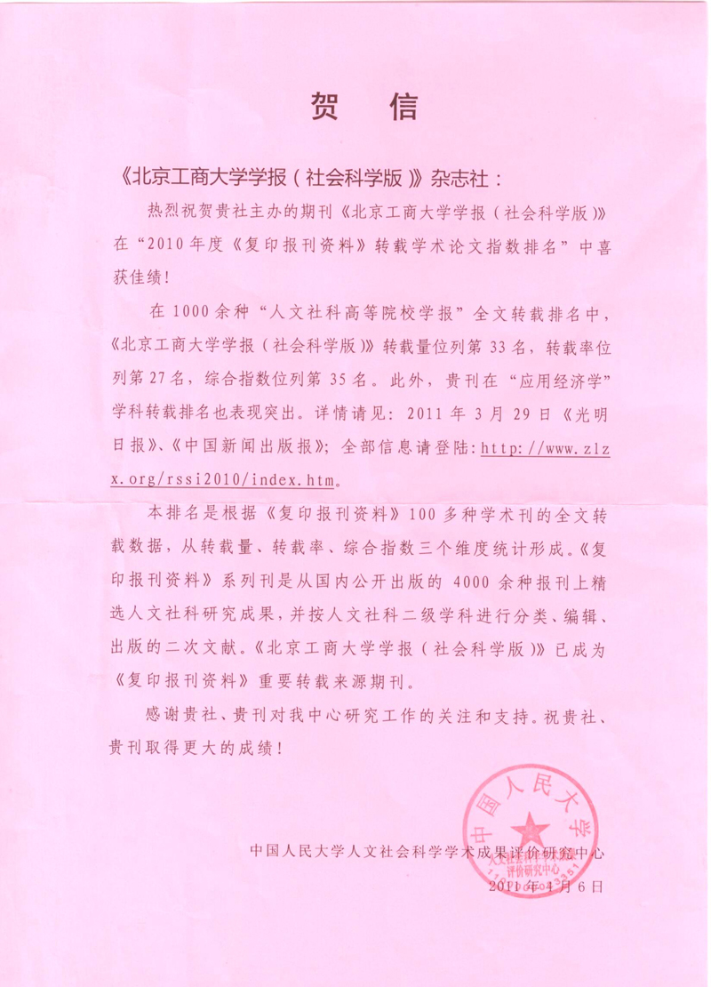 贺信称,在1000余种“人文社科高等院校学报”全文转载排名中,《色情片学报(社会科学版)》转载量位列第33名,转载率位列第27名,综合指数位列第35名;在“应用经济学”学科转载排名中,《色情片学报(社会科学版)》也表现突出。
