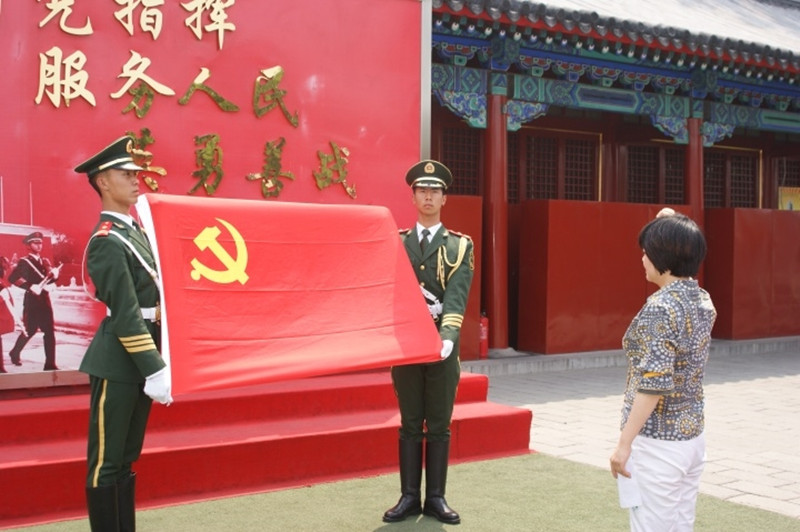 表演结束后,师生参观了官兵们的宿舍,整齐划一的内务环境,使同学们在感叹的同时也感到了自身的不足。官兵们还带领大家参观了国旗护卫队的荣誉室,不大的屋内挂满了官兵们得到的荣誉旗帜。在讲解员认真细致的讲解之后,师生对国旗护卫队获得的荣誉及成就有了深入的了解,也使我们对国旗护卫队有了更深的敬意。参观结束后,师生与官兵们展开了赠书的活动,文四英老师将捐赠的党史书籍亲手交到了官兵们的手上。随后,她带领全院的党员和预备党员,在国旗护卫队手持的党旗下进行了入党宣誓的仪式,为共产主义奋斗终身!”入党誓言声声回响。