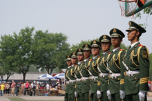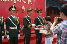 上午九点,师生来到了天安门国旗护卫队的驻地。尽管天气炎热,但大家依旧精神饱满。国旗护卫队的官兵对师生的到来表示热烈的欢迎,并为师生单独进行了国旗护卫队队列展示。挺拔的身姿,矫健的步伐,使大家惊叹不已,大家纷纷对官兵们艰苦训练展示出的成果发出由衷地赞叹和感动。