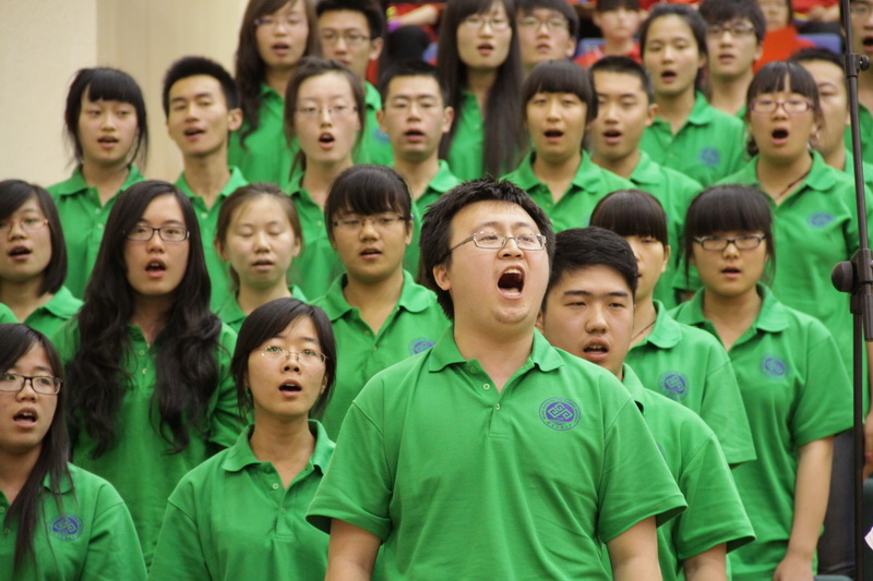 第一个演唱的外国语学院以《年轻的朋友来相会》开唱,展现了当代大学生的青春活力。应着全场观众的掌声,《红旗飘飘》的歌声飘荡全场,诠释了当代大学生对祖国的无限热爱。