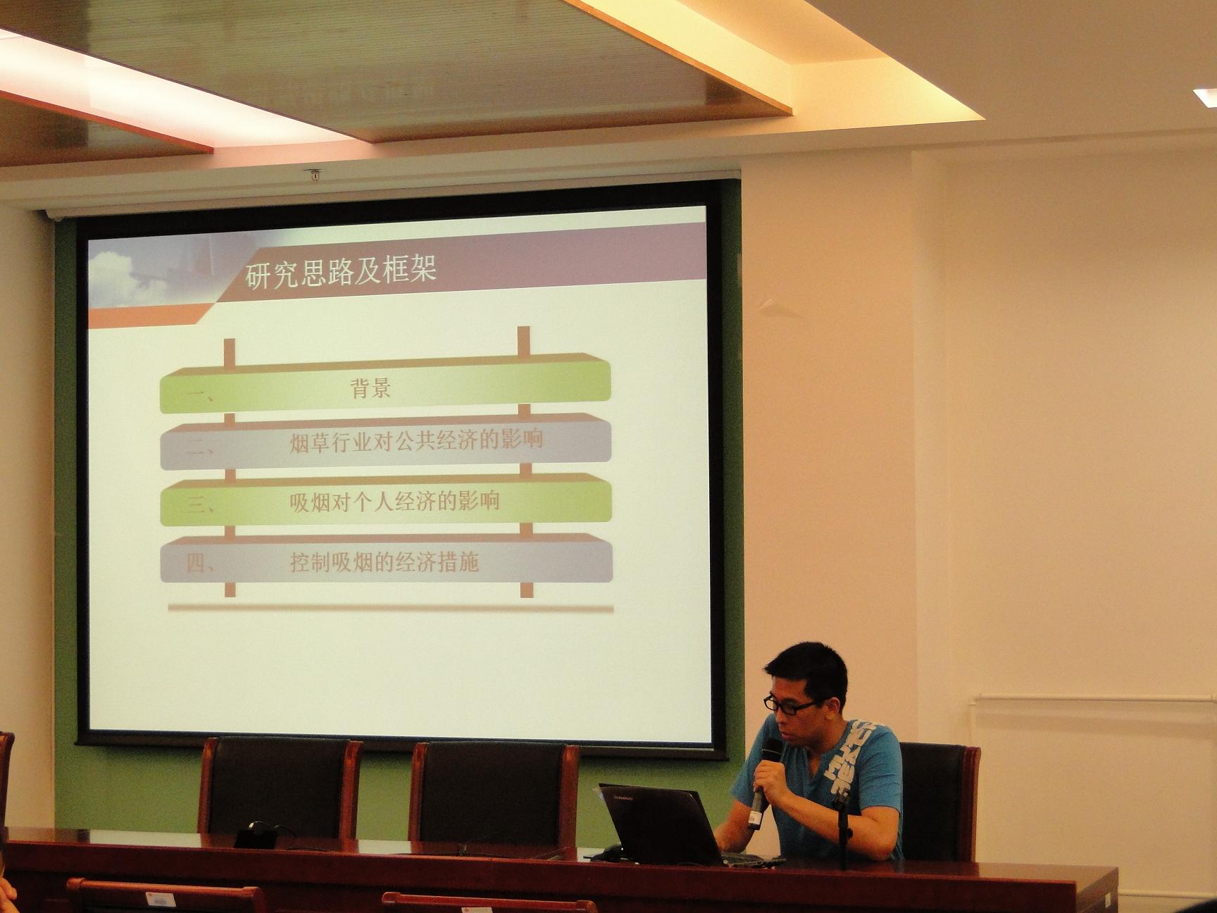 研究生会副主席马莉同学对世界无烟日的前期宣传工作情况进行了简要介绍,并用幻灯片的形式展示了关于无烟日的由来、历年主题、吸烟对人体的危害等内容。来自商学院、经济学院、食品学院、计信学院、法学院的研究生们分别从各自专业角度,以吸烟收益模型、控烟的经济学手段、烟雾化学成分分析及危害、烟雾自动监测报警技术、控烟法律效力和执行方式等作为主题,通过生动的图片、直观的模型、详实的分析,多视角全方位地向大家介绍了如何看待吸烟问题,并提出了以自己的调查分析为基础提出了可行性解决办法。