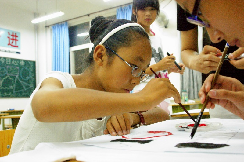在短暂却不平凡的几天内,经济学院的成员们满怀信心,为孩子们送去了热情周到的服务和精彩有趣的课程。今天,为更好地培养孩子们的动手能力和创造力,成员们开展了与孩子一起绘制文化衫的活动。孩子们在老师的指引下,积极拿起手中的画笔用心绘制;还有的孩子活学活用,将京剧文化课上学到的脸谱绘画展现了出来。当原本空白的衣服上出现一个个有生命的图案时,心手相连的我们一同露出满足的笑容。孩子们用稚嫩的画笔描绘出对祖国的一片热爱,缤纷了梦想和希望。