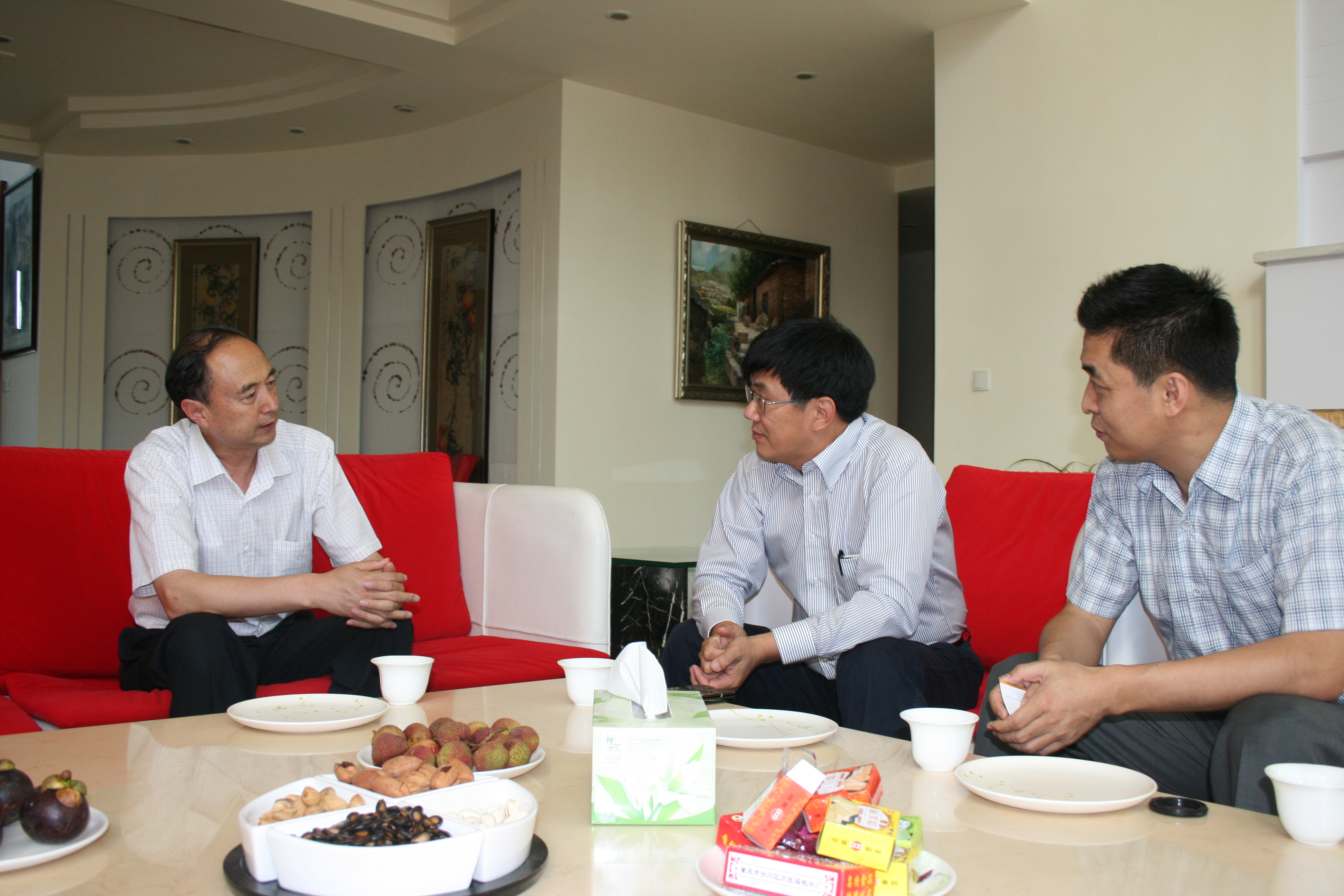 卢思锋副书记在参观完金港汽车花园后,与叶明钦校友进行了亲切座谈。卢书记介绍了学校近年的发展状况和学校校友会教育基金会工作开展况。他对金港汽车花园表示赞赏,同时对叶明钦校友在学校60周年校庆期间对学校的捐赠表示感谢,并向叶明钦校友颁发了捐赠证书和纪念品。