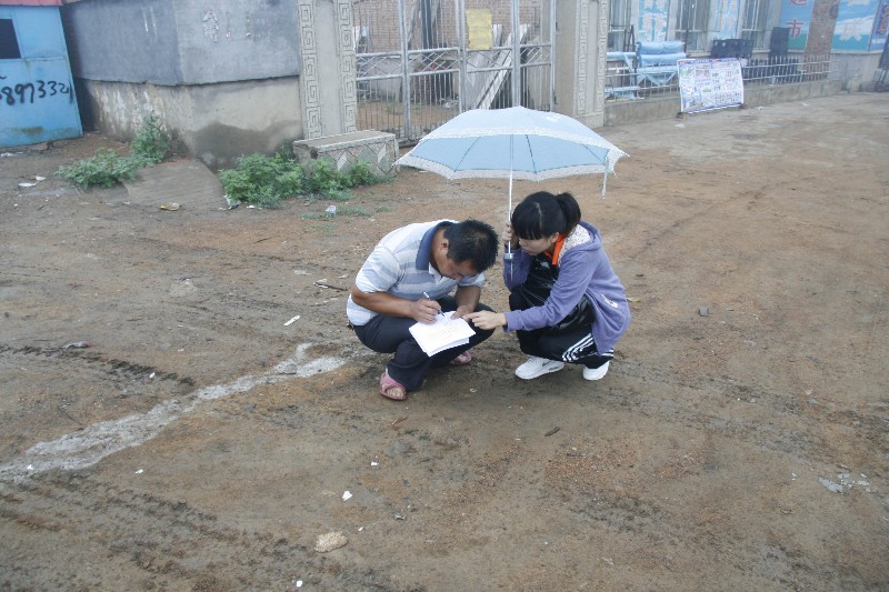 随后,我们在雨中走入四家子村继续我们几天来的问卷调查工作。虽然天一直在下雨,但服务团的同学们并没有因此而停止工作,在村里的道路上找行人开始我们的调研,如果接受调研的行人没有带雨伞,服务团的同学会用自己的伞帮他们挡雨,以保证调研的顺利进行。四家子村的村民也非常配合我们,他们几乎不拒绝,非常热情地接受着我们的问卷调查,在做调研的过程中还会表达他们对现在国家下达的一系列对农民的优惠政策感到非常满意。